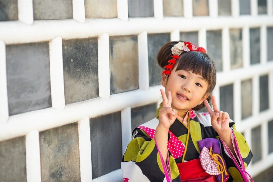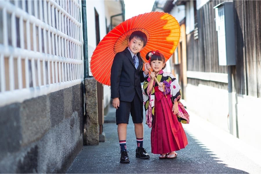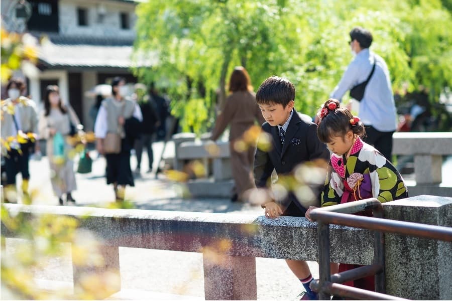 高低差はほとんどないのですが、人が多く、撮影場所から次の撮影場所まで長い距離を歩くことが多いので、小さいお子さんが一緒の場合、ずっと抱っこで移動することになったりします。落ち着いて撮影できる場所が少ないので、3歳児の七五三などはあまりお勧めできる環境ではありません。逆に5歳男の子や7歳女の子の場合は、長い距離も問題なく、散策を楽しみながら撮影ができて良いかと思います。草履が履けない、または草履で足が痛くなる子が続出するので練習をしておいた方が良いかもしれません。