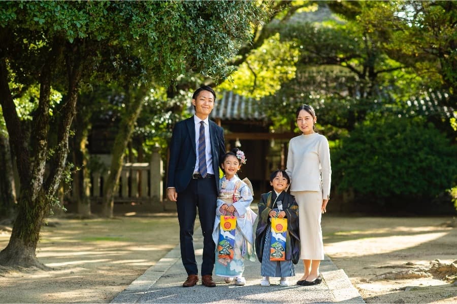 当店で着付・ヘアメイクをした場合、当店から宗忠神社までマイカーなどで移動していただくこととなります。道路が空いていれば10分少々で到着できます。駐車場は広い無料駐車場があるので安心です。