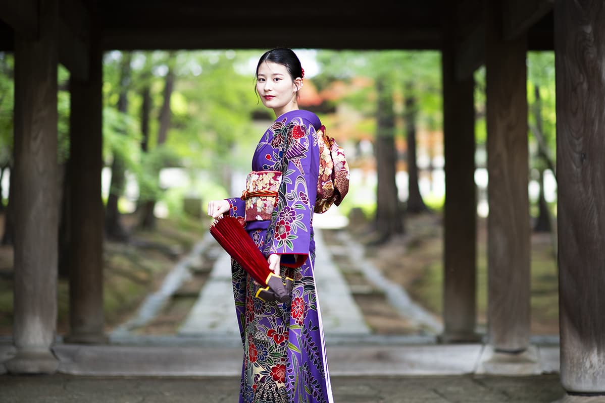 当店で着付・ヘアメイクをした場合、当店から曹源寺までマイカーなどで移動していただくこととなります。道路が空いていれば20分少々で到着できますが、混雑していると40分ほどかかる場合がございます。駐車場はそれほど広くありませんのでシーズン中の土日祝日は注意が必要です