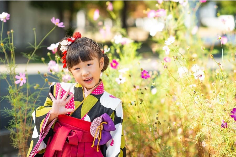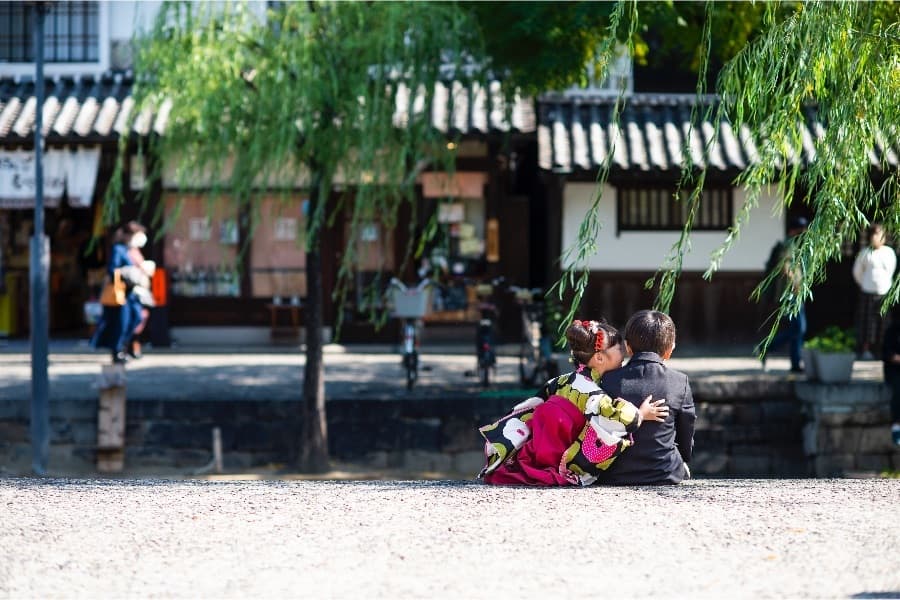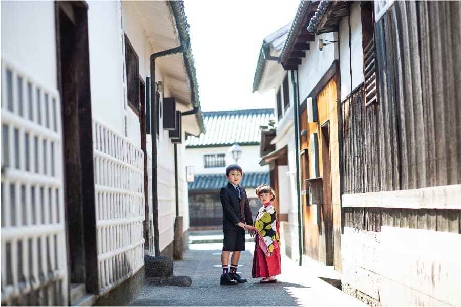 高低差はほとんどないのですが、人が多く、撮影場所から次の撮影場所まで長い距離を歩くことが多いので、小さいお子さんが一緒の場合、ずっと抱っこで移動することになったりします。落ち着いて撮影できる場所が少ないので、3歳児の七五三などはあまりお勧めできる環境ではありません。逆に5歳男の子や7歳女の子の場合は、長い距離も問題なく、散策を楽しみながら撮影ができて良いかと思います。草履が履けない、または草履で足が痛くなる子が続出するので練習をしておいた方が良いかもしれません。