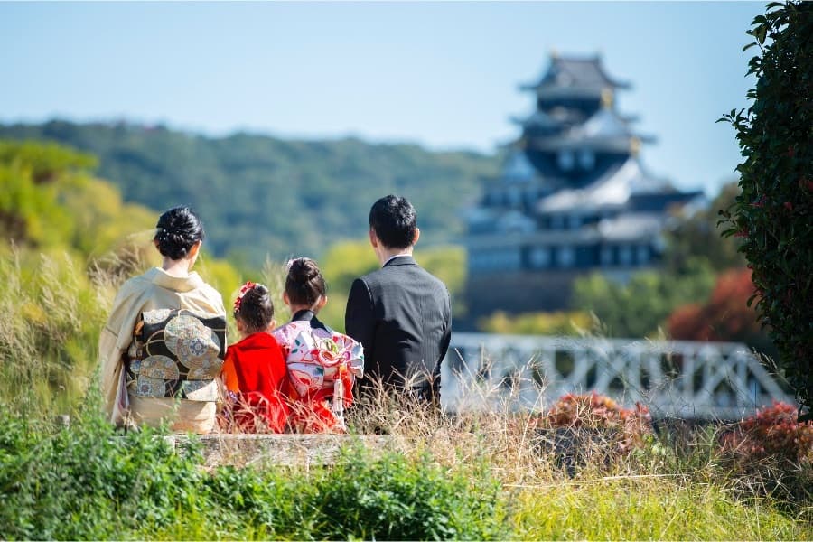 当店で着付・ヘアメイクをした場合、当店から岡山神社までマイカーなどで移動していただくこととなります。道路が空いていれば20分少々で到着できますが、混雑していると40分ほどかかる場合がございます。駐車場は広い駐車場があります。混雑時は駐車場渋滞が起きることもありますので注意が必要です。