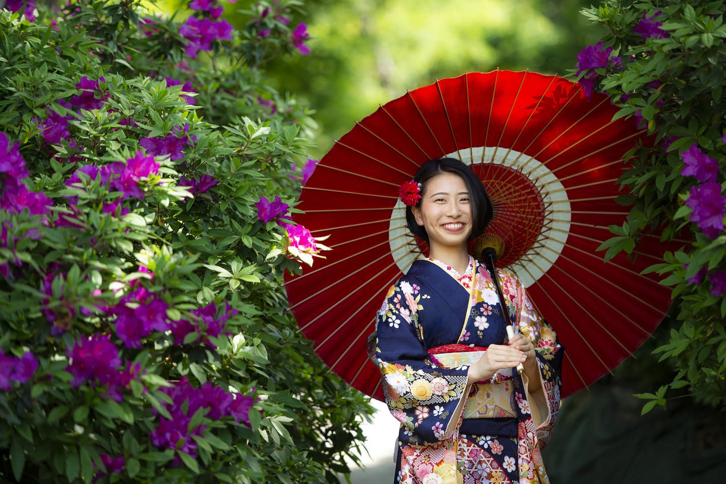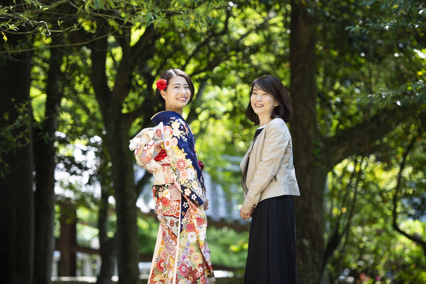 当店で着付・ヘアメイクをした場合、当店から吉備津神社までマイカーなどで移動していただくこととなります。道路が空いていれば30分少々で到着できます。駐車場は広い無料駐車場があるので安心です。