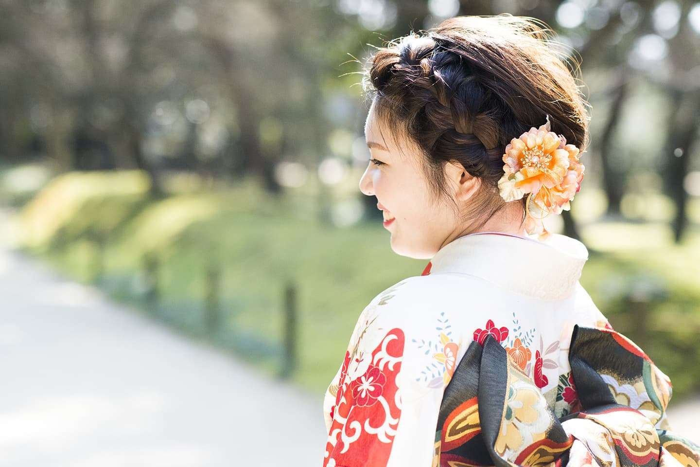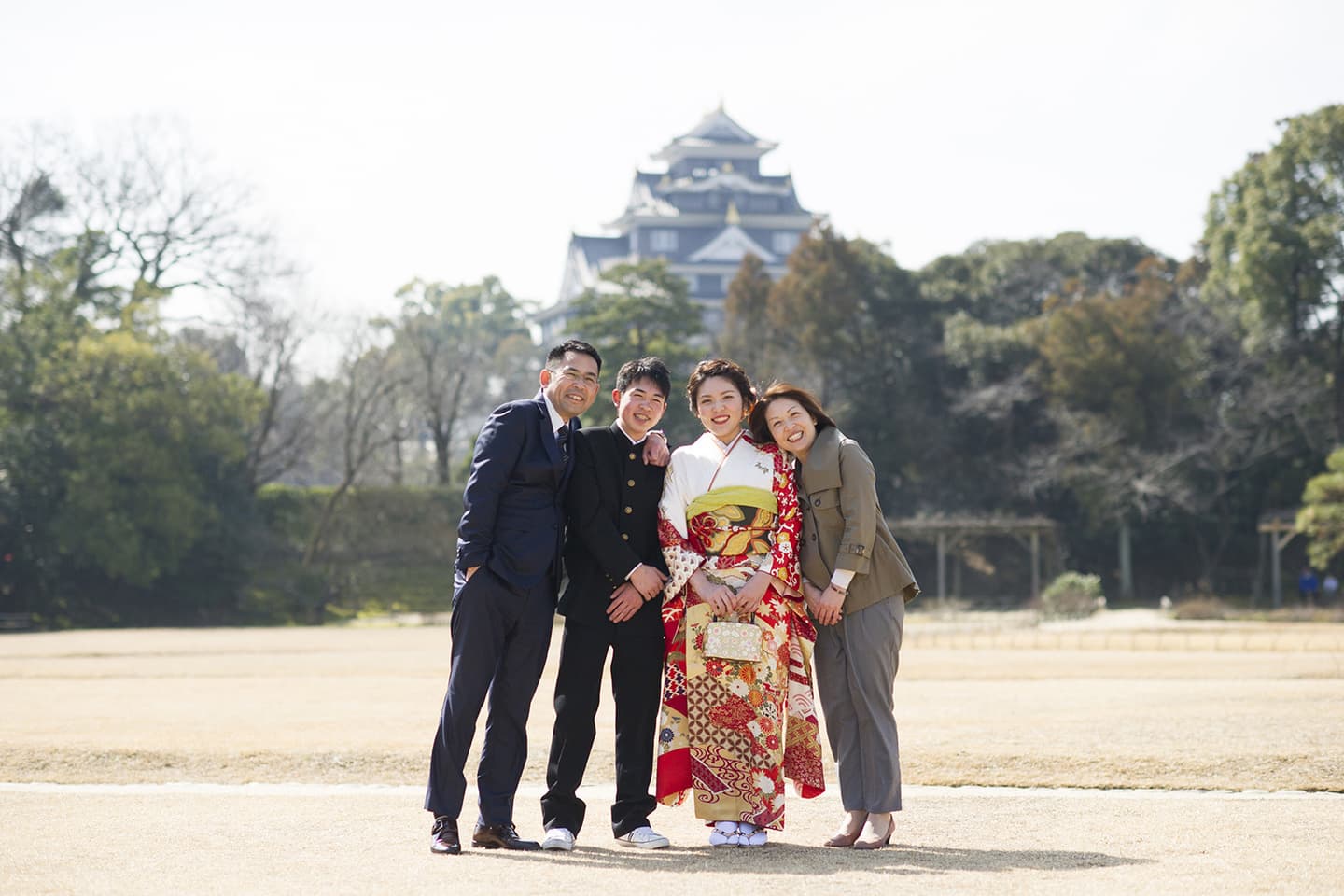 当店で着付・ヘアメイクをした場合、当店から後楽園までマイカーなどで移動していただくこととなります。道路が空いていれば20分少々で到着できますが、混雑していると40分ほどかかる場合がございます。駐車場は広い有料駐車場があります。駐車場から後楽園入り口までが遠いので、注意が必要です。後楽園へ入るには入園料(大人410円 高校生以下無料)が必要です。