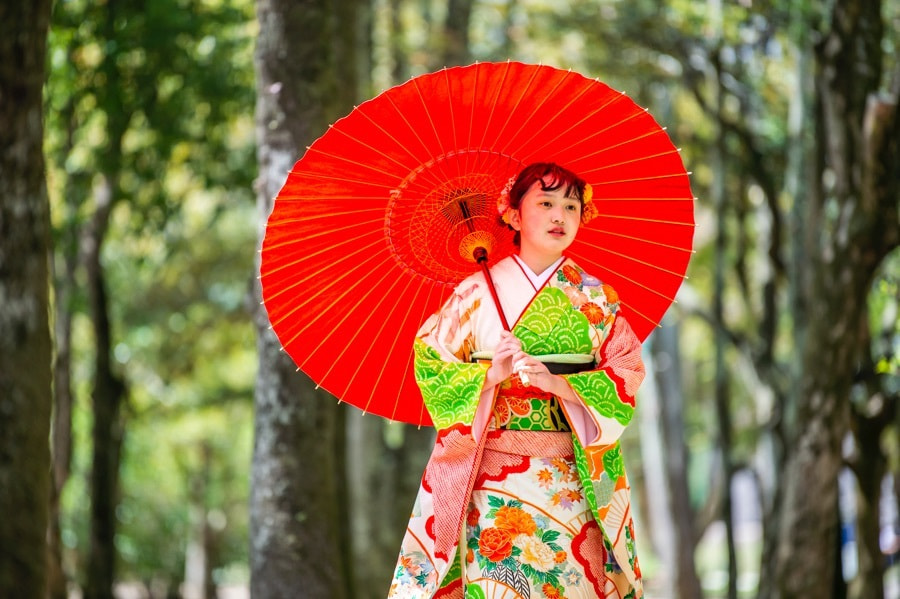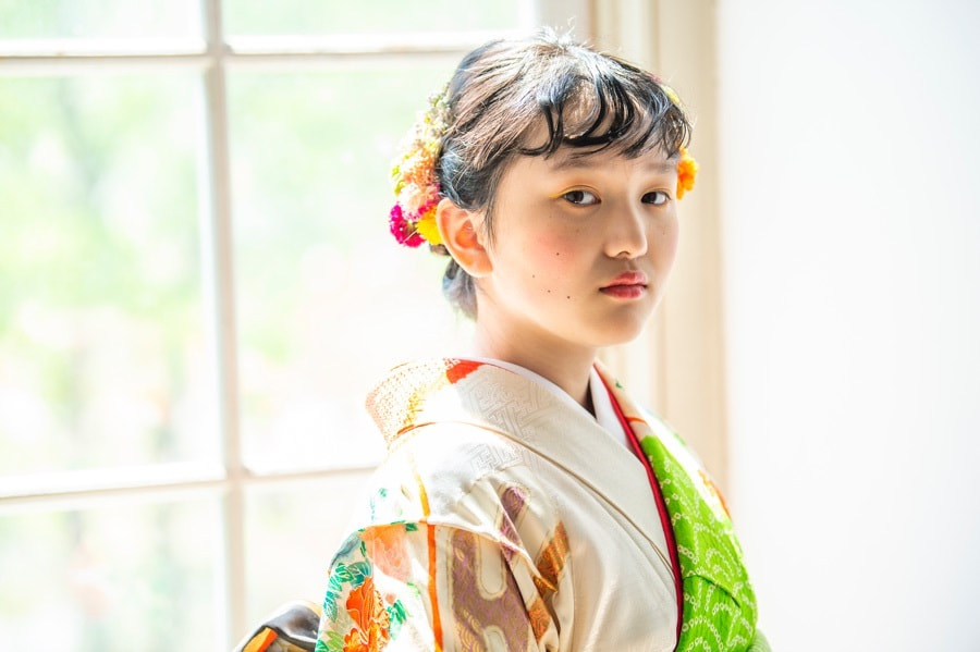 現地で振袖を着て、ヘアメイクをし、記念写真を80カットほど撮影いたします。